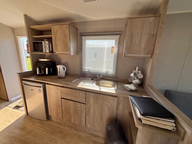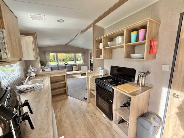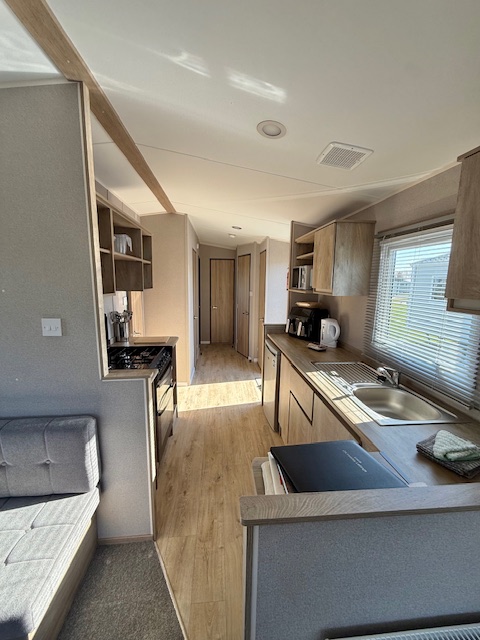 The caravan entrance opens up to a modern open plan kitchen and dinning. The kitchen is equipped with everything you need to cook up a lovely meal.