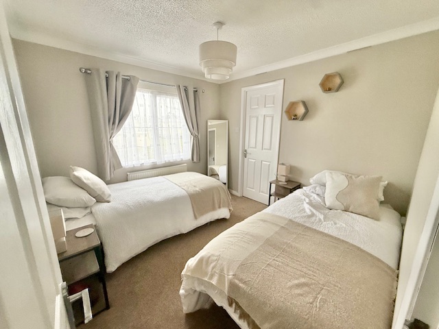 The second bedroom has two full size single beds, with an infant bed stored under one of them, Aswell as a walk in wardrobe.